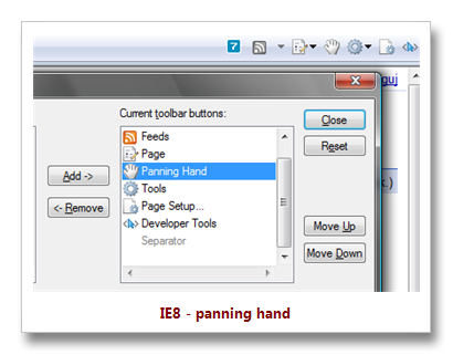W IE8 trafiłem na ciekawą funkcję, mianowicie Panning Hand - nie wiem czy ona występuje tylko gdy system ma włączoną funkcjonalność Tablet PC, ale jeśli ją Microsoft dopracuje do czasu finalnego wydania IE 8, że można będzie w wygodny sposób przełączać między panning hand i zaznaczaniem tekstu, będzie to genialna opcja dla posiadaczy wszelkich urządzeń z dotykowym ekranem lub użytkowników tabletów (sam mam Bamboo One). Korzystałem jakiś czas z wtyczki Grab and drag dla firefoksa, ale stała się bardzo irytująca - za dużo klikania by przełączać między tymi trybami.